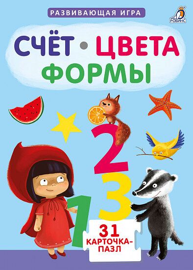 Счет. Цвета. Формы — это обучающая и развивающая игра из 31 двусторонней карточки-пазла и 2 карточек с инструкцией. С ее помощью ваш ребёнок легко и быстро выучит цифры, цвета и формы, а также научится сравнивать, считать и придумывать загадки.