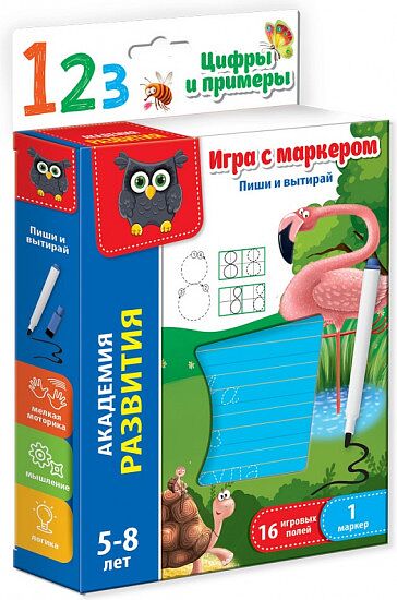 На красочных карточках собрались цифры и примеры. Нужно лишь взять в руки маркер и «оживить» их! Выбираем карточку, внимательно изучаем цифру и обводим ее контуры! После этого пишем цифру самостоятельно. Если ребенок сделал ошибку, маркер можно легко стереть и написать заново. Когда все цифры пройдены, берем карточки с примерами и решаем их. В процессе игры малыш быстро запомнит цифры, научится считать, а также потренирует память, логическое мышление и мелкую моторику. А благодаря маркеру «Пиши-вытирай» к пройденному материалу можно возвращаться множество раз.