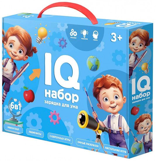 IQ-набор — это 6 в 1 для всестороннего развития ребёнка! С ним ребёнок освоит азы логики и математики, научится легко ориентироваться в пространстве и прокачает творческий и эмоциональный интеллект. В комплекте: • 2 карточные игры серии «Игры для ума». • настольная игра «IQ-стрелки». • пазл на 25 деталей. • раскраска и лабиринты.