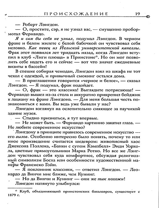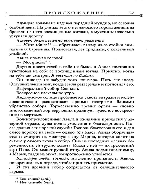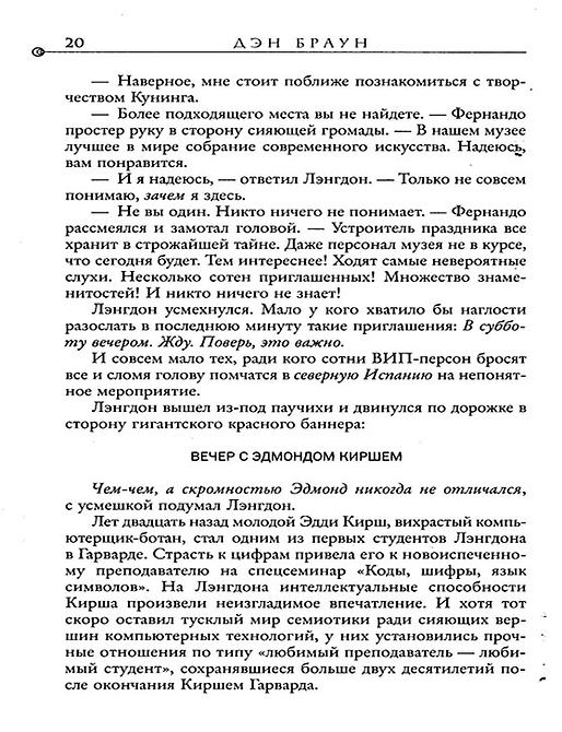 Новый роман от автора абсолютного бестселлера Код да Винчи! Продолжение романов Ангелы и демоны, Код Да Винчи, Утраченный символ и Инферно. Во всем мире продано свыше 200 000 000 книг Дэна Брауна! Профессор Роберт Лэнгдон начинает новое расследование! Роберт Лэнгдон прибывает в музей Гуггенхайма в Бильбао по приглашению друга и бывшего студента Эдмонда Кирша. Миллиардер и компьютерный гуру, он известен своими удивительными открытиями и предсказаниями. И этим вечером Кирш собирается перевернуть все современные научные представления о мире, дав ответ на два главных вопроса, волнующих человечество на протяжении всей истории: Откуда мы? Что нас ждет? Однако прежде чем Эдмонд успевает сделать заявление, роскошный прием превращается в хаос. Лэнгдону и директору музея, красавице Амбре Видаль, чудом удается бежать. Теперь их путь лежит в Барселону, где Кирш оставил для своего учителя закодированный ключ к тайне, способной потрясти сами основы представлений человечества о себе. Тайне, которая была веками похоронена во тьме забвения. Тайне, которой, возможно, лучше бы никогда не увидеть света, - по крайней мере, так считают те, кто преследует Лэнгдона и Видаль и готов на все, чтобы помешать им раскрыть истину.