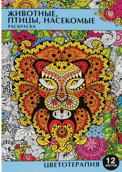 Раскраска-антистресс, А4, 12л, ЖИВОТНЫЕ, ПТИЦЫ, НАСЕКОМЫЕ