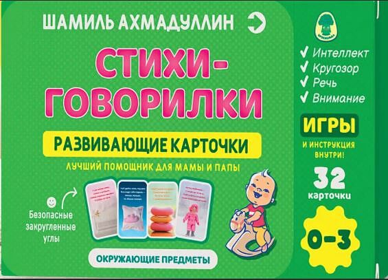 В первый год жизни особенно важно познакомить малыша с большим количеством окружающих его предметов и сделать это грамотно. Набор развивающих карточек Стихи - говорилки от Шамиля Ахмадуллина со стихами и картинками отлично подойдут для этого. В наборе вы найдете 32 двусторонние карточки из плотного картона с закругленными углами. На первых 30 карточках стихотворения о вещах, с которыми ребенок встречается чаще всего, а на двух последних 60 картинок, которые нужны для развивающих игр. Стихи на карточках помогают вовлечь ребенка в общение и побуждают его сначала лепетать, а потом и говорить. Картинки тренируют зрительное восприятие и способствуют запоминанию предметов, а также умение сопоставлять реальные предметы с их изображениями. Развивайте речь и кругозор малыша легко и увлекательно!