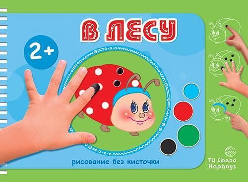 Тема - лес.И что же там? Всё как обычно: растут грибы и ягоды, ёжик ищет дикие яблоки, комары жужат, у лесного озера летают стрекозы... Прежде чем рисовать в книжке с ребенком, просмотрите ее сами. Понятно, что картинки в книжке предназначены для рисования пальчиками. Обратите внимание на пояснительные странички к иллюстрациям. На них расположены: - Сопроводительные тексты, которые помогут вам заинтересовать ребенка иллюстрацией и рисованием в ней. Введение в ситуацию крайне желательно для создании мотивации к последующей работе. Каждый основной текст-презентацию дополняем фразами (под рубрикой Что еще можно сказать), которые мы рекомендуем употреблять уже в процессе творческого порыва. - На этих же страничках в левом нижнем углу нарисованы четыре баночки с красками. Это значит, что мы работаем в пределах четырех цветов. Этого вполне достаточно для увлекательного рисования в этом возрасте. Понятно, иллюстрации, которые нужно раскрашивать четырьмя цветами - самые сложные. А серый цвет баночек означает отсутствие цвета. Такая ориентировка позволит вам самим выбирать сложность картинки для занятия, постепенно усложняя работу малыша с одного цвета до четырех. Помните, что рисование пальчиками это все-таки прежде всего точки, а не линии. Мы учим ребенка легко и координированно работать в пределах листа, а также пытаемся привить чувство ритма и гармонии.