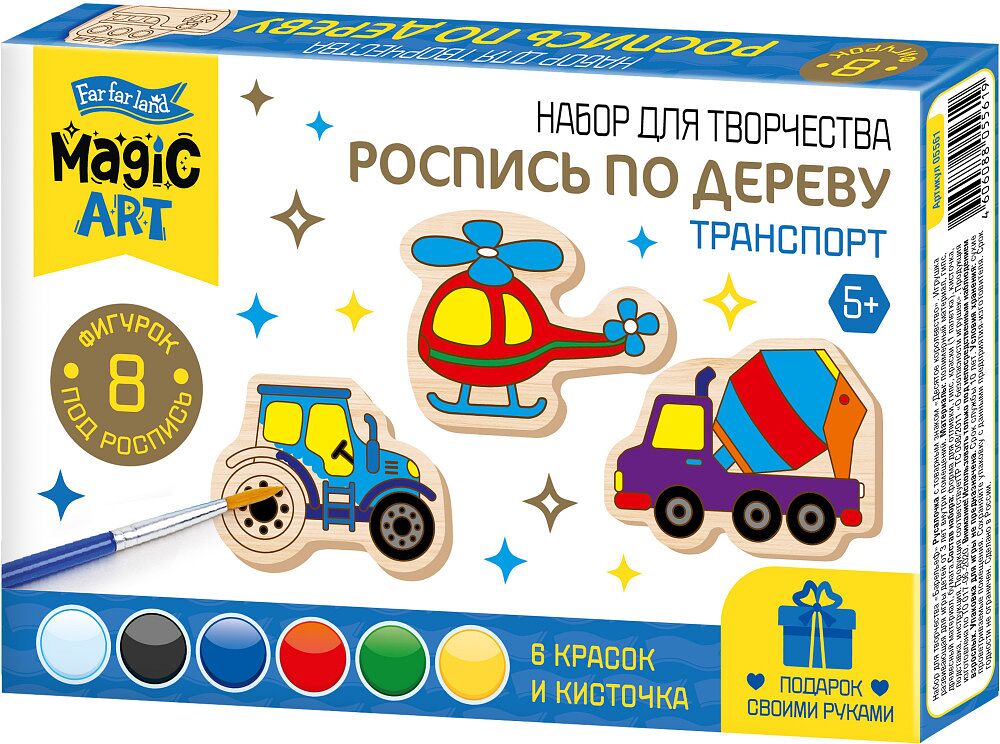 Набор роспись по дереву «Транспорт» — это 8 фигурок из древесного материала: вертолет, самолет, трактор, легковой автомобиль, пожарная машина, бетономешалка, трамвай и корабль, которые нужно раскрасить. Все необходимое для творчества входит в набор! Рекомендуется для детей старше 5 лет. Состав набора: • акриловые краски (белый, черный, синий, красный, зеленый, желтый цвет) −6 шт.. • фигурки из древесного материала (размеры 7 × 9 см) — 8 шт.. • кисточка — 1 шт. Как играть? Для росписи используйте как чистые цвета, так и смесевые, полученные при смешивании 2 или 3 разных красок. Смешивать краски можно на листе бумаги или палитре. Примеры смешения цветов смотрите на обратной стороне упаковки. Расписывать фигурки можно так, как показано на упаковке, а можно руководствуясь собственной фантазией. Начинать роспись лучше со светлых тонов, а заканчивать — темными. При переходе от одного цвета к другому и по окончании работы необходимо тщательно мыть кисточку. Не оставляйте баночки с краской надолго открытыми, чтобы краски не высыхали.