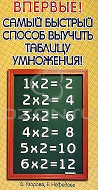 Заучивание таблицы умножения нельзя заменить полностью, но можно облегчить почти наполовину. С помощью этой системы возможно уменьшить время заучивания почти в два раза! Откройте брошюру и посмотрите, как каждая из таблиц разбивается на белые и желтые панельки. Можно пропускать примеры, напечатанные в белой панельке, так как они изучены из предыдущей таблицы. Выучите все примеры на желтых панелях - и таблица умножения будет изучена на отлично!
