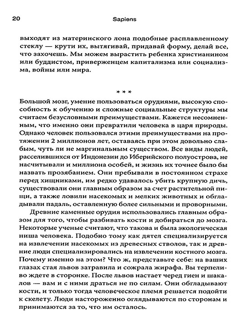 Сто тысяч лет назад Homo sapiens был одним из как минимум шести видов человека, живших на этой планете, - ничем не примечательным животным, которое играло в экосистеме роль не большую, чем гориллы, светлячки или медузы. Но около семидесяти тысяч лет назад загадочное изменение когнитивных способностей Homo sapiens превратило его в хозяина планеты и кошмар экосистемы. Как человек разумный сумел покорить мир? Что стало с другими видами человека? Когда и почему появились деньги, государства и религия? Как возникали и рушились империи? Почему почти все общества ставили женщин ниже мужчин? Как наука и капитализм стали господствующими вероучениями современной эры? Становились ли люди с течением времени счастливее? Какое будущее нас ожидает?