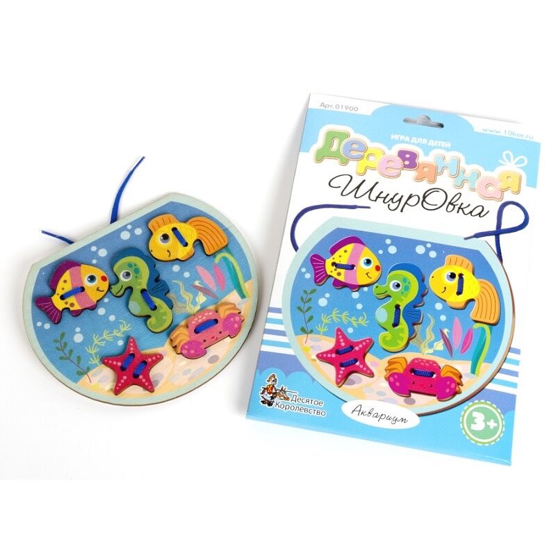 Оригинальная деревянная шнуровка, выполненная в форме аквариума с обитателями, подарит малышу массу положительных эмоций и позволит непоседе от 3-х лет в процессе этой увлекательной игры развить мелкую моторику, внимание, логическое мышление, координацию движения рук, укрепить мускулатуру пальчиков. Деревянная шнуровка «Аквариум» изготовлена из высококачественной фанеры, толщиной 3,5 мм, изображение нанесено на одной стороне безопасными красками на водной основе. В состав детской шнуровки входят: - деревянная основа в виде аквариума – 1 шт. - деревянные детали для шнурования – 5 шт. - цветной шнурок – 1 шт. Ребенку предстоит при помощи шнурочка «пришить» к импровизированному аквариуму 5 элементов – 2 рыбки, морского конька, краба и морскую звезду.