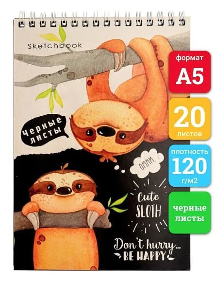 Скетчбук А5, 20л. МЕДЛИТЕЛЬНЫЕ ЛЕНИВЦЫ (20-5662) греб, обл.мелов.картон, черный блок, жестк.подл
