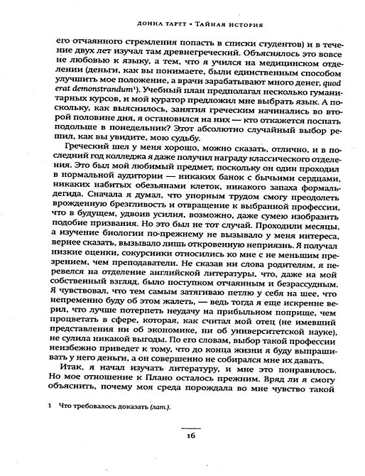 Блестящая американская писательница Донна Тартт, лауреат Пулитцеровской премии 2014 года, покорила читателей первым же своим романом ТАЙНАЯ ИСТОРИЯ. Книга сразу стала бестселлером. Она переведена на двадцать пять языков и продолжает расходиться многомиллионными тиражами во всем мире. Действие происходит в небольшом колледже в Вермонте, куда девятнадцатилетний Ричард Пейпен приезжает изучать древнегреческий язык. Новые друзья Ричарда - четверо молодых людей и одна девушка - умны, раскованны, богаты и так увлечены античной культурой, что рассматривают себя чуть ли не как особую касту ее хранителей. Их дружба не выдерживает, однако, натиска современного мира. В веселой и сплоченной компании происходит убийство. Пытаясь через много лет осмыслить случившееся, герой по дням воспроизводит свою студенческую жизнь, этапы отношений с однокурсниками и любимой девушкой. Под виртуозным пером Донны Тартт его исповедь превращается в захватывающий психологический триллер.