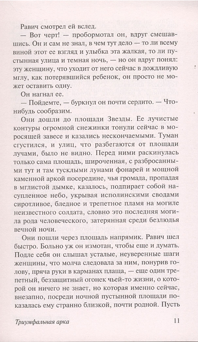 Триумфальная арка - пронзительная история любви всему наперекор, любви, приносящей боль, но и дарующей бесконечную радость.Место действия - Париж накануне Второй мировой войны. Герой - беженец из Германии, без документов, скрывающийся и от французов, и от нацистов, хирург, спасающий человеческие жизни. Героиня -итальянская актриса, окруженная поклонниками, вспыльчивая, как все артисты, прекрасная и неотразимая.И время, когда влюбленным довелось встретиться, и город, пронизанный ощущением надвигающейся катастрофы, становятся героями этого романа...Триумфальная арка была дважды экранизирована и по-прежнему покоряет читателей всего мира.