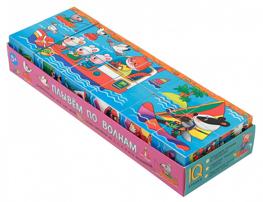 Набор состоит из 12 кубиков размером 4х4 см. Ребёнку нужно сложить картинки из 2, 4 и 6 фрагментов. В этом ему помогут листовки-подсказки с изображением водного транспорта. Далее транспорт можно соединить в любой последовательности, картинки взаимозаменяемы. Во время игры происходит знакомство с понятиями часть и целое, развивается умение работать по образцу. Наклейки на кубики сделаны из качественной гладкой бумаги, которая не портится от игры. Набор предназначен для детей от 5 лет.