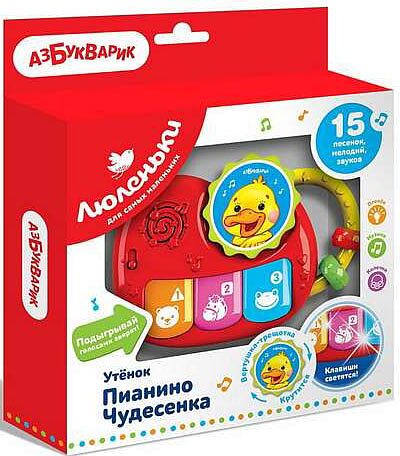 Миниатюрная игрушка-пианино разработана специально для малышей. Нажимая на яркие клавиши ребенок послушает 6 милых песенок о зверятах. Переключите режим – и на клавишах зазвучат веселые мелодии. Под них кроха сможет сам подыграть голосами зверят и смешными звуками. Эта игра не только развлекает, но и развивает у ребенка воображение и музыкальные способности. Во время звучания песенок и мелодий клавиши светятся. Также малышу понравится крутить колесико с забавной зверюшкой и слушать звук трещотки. А яркие колечки и рельефные элементы игрушки так приятно трогать детскими пальчиками! Пианино удобно носить с собой. Бонус для покупателей Пианино Чудесенка – 5 интерактивных сказок для смартфона и планшета. Просто отсканируй QR-код на упаковке!