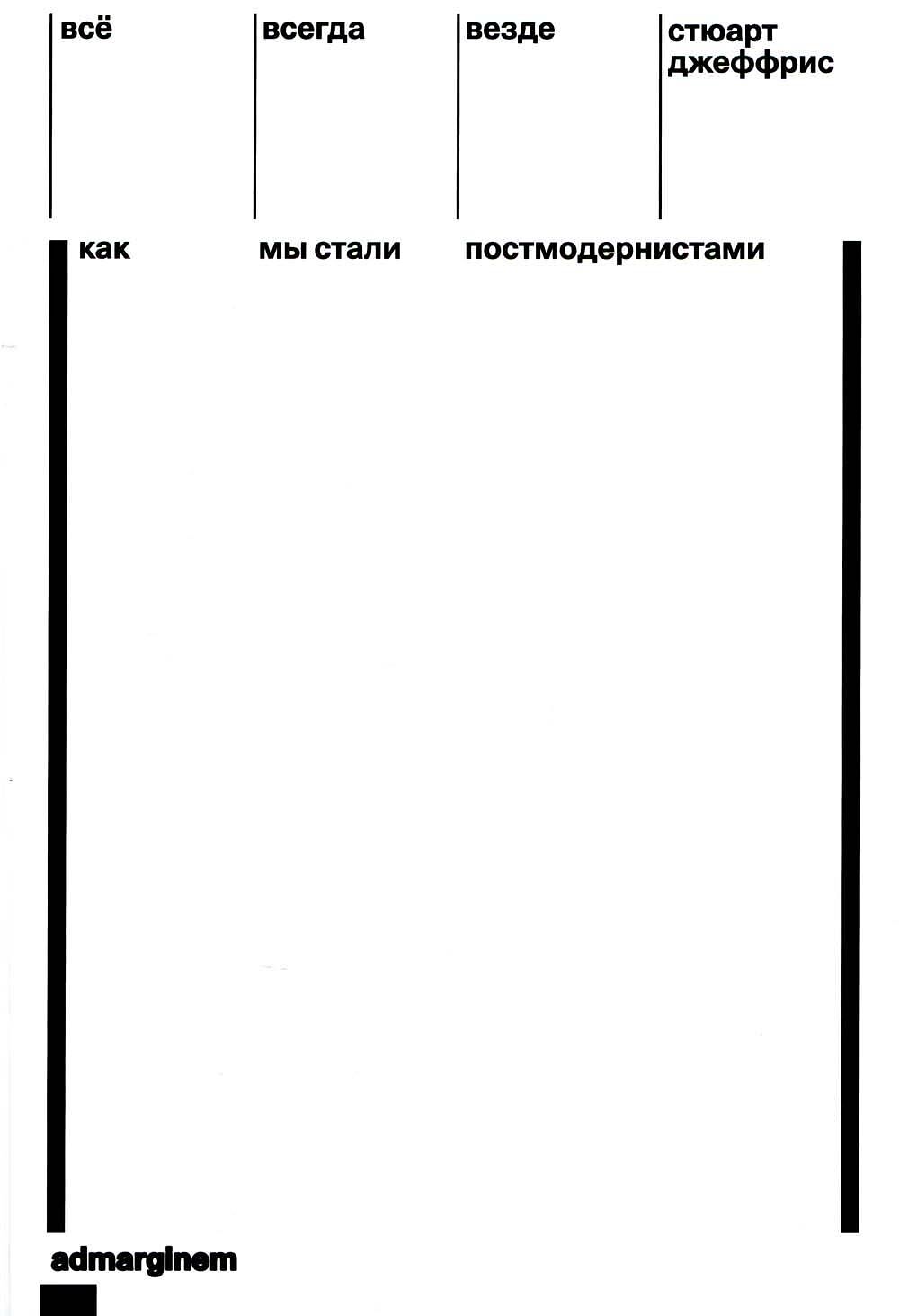 Стюарт Джеффрис (род. 1962), британский публицист, колумнист Guardian, автор нескольких книг, на сей раз предлагает читателям панорамный или, скорее, калейдоскопичный обзор полувековой на сегодняшний день истории постмодерн(изм)а - то ли культурной парадигмы, то ли стиля, то ли состояния, спутавшего карты приверженцам линейных исторических нарративов и смешавшего, кажется, всё и вся: высокое и низкое, старое и новое, правду и вымысел, искусство и поп-культуру и т. д. Среди героев книги - философы, политики, художники, стартаперы, кинорежиссеры, архитекторы, музыканты и активисты, представители всех сфер культурного (и только ли?) производства, внесшие свой вклад в великое стирание границ, которое поставило под вопрос всякие иерархии (вместо них теперь - всё), временные рубежи (всё теперь всегда) и собственно границы (всё - везде). Джеффрис, в свою очередь, постмодернистски ставит под вопрос сам постмодернизм, показывая, что заложенный в него неолиберальным капитализмом эмансипаторный заряд не сработал, но в то же время признает, что коль скоро мы стали постмодернистами, у нас нет пути назад.