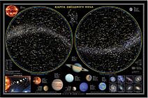 Звездное небо представлено в виде карт северного и южного полушарий (в азимутальной проекции) с изображением неподвижных или медленно изменяющихся объектов звёздного неба - звезды, туманности, галактики. Звезды отражены по величине и по следующему классу: двойные, переменные и навигационные. Отражена Солнечная система - Солнце и обращающиеся вокруг него небесные тела - 8 планет (Плутон признан в 2006 на 26 Ассамблее Международного астрономического союза карликовой планетой) и их основные характеристики. Для более точного представления звездного неба даны таблицы характеристик галактик, туманностей, самых ярких звезд и проч. Карты выполнена на плотной бумаге, покрыта ламинацией. Размер 58х38 см.